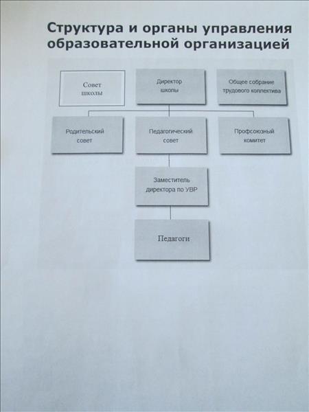 Общеобразовательная организация состоит из следующих ступеней образования: - Начальное общее - Основное общее Состав организации: - административные работники - педагоги - обслуживающий персонал Управление общеобразовательной организацией осуществляется в соответствии с законодательством Российской Федерации и Уставом общеобразовательной организации и строится на принципах демократии, гуманизма, общедоступности, приоритета общечеловеческих ценностей, жизни и здоровья человека, гражданственности, свободного развития личности. Управление школой осуществляется на основе сочетания принципов единоначалия и самоуправления. Основными формами самоуправления в общеобразовательной организации являются общее собрание трудового коллектива, педагогический Совет, Совет школы. В основу положена четырехуровневая структура управления. Первый уровень структуры м- уровень директора (по содержанию - это уровень стратегического управления) Директор организации определяет стратегию развития школы, представляет ее интересы в государственных и общественных инстанциях. Общее собрание трудового коллектива, Совет школы обсуждают и принимают план развития организации. Руководитель общеобразовательной организации несет ответственность перед обучающимися,их родителями (законными представителями), государством, обществом и учредителем за результаты своей деятельности в соответствии с функциональными обязанностями, предусмотренными квалификационными требованиями, трудовым договором (эффективным контрактом) и уставом школы. На втором уровне структуры (по содержанию - это тоже уровень стратегического управления) функционируют традиционные субъекты управления: педагогический совет, совет школы, родительский комитет, общее собрание трудового коллектива, профсоюзный орган. Третий уровень организационной структуры управления - уровень учителей, воспитателей, функциональных служб (по содержанию -это уровень оперативного управления), структурных подразделений школы. Четвертый уровень организационной структуры - уровень обучающихся. По содержанию - это тоже уровень оперативного управления, но из-за особой специфичности субъектов, этот уровень скорее можноназвать уровнем "самоуправления". Формами самоуправления школы являются: Совет школы Общее собрание трудового коллектива Педагогический Совет Совет школы является органом общественного самоуправления в организации, который включает в себя представителей учащихся, родителей, педагогов. Общее собрание трудового коллектива Организации является органом общественного самоуправления в организации, который включает в себя весь трудовой коллектив Организации. Общее собрание считается правомочным, если на нем присутствует не менее двух третей списочного состава работников организации. Решения общего собрания принимаются открытым голосованием, простым большинством голосов. Каждый член общего собрания имеет один голос. при равном количестве голосов решаюшим является голос председателя собрания. Решение, принятое в пределах компетенции общего собрания и не противоречащее законодательству РФ, является обязательным. Общие собрания проводятся по мере необходимости, ноне реже одного раза в год. О повестке дня, времени и месте его проведения должно быть объявлено не ме